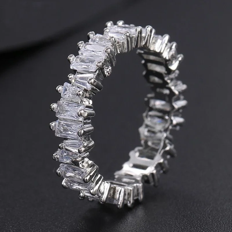 The Iced Baguette Eternity Band is a breathtaking combination of elegance and sparkle. Featuring a continuous band of high-quality cubic zirconia (CZ) baguette stones, this eternity ring offers a luxurious, radiant shine without the premium price tag of real diamonds. The stones are set in a micro-pave prong setting, ensuring each one is securely held while maximizing their brilliance. With its timeless design and sophisticated appeal, this ring is perfect for those who want to add a touch of glamour to any occasion, whether worn alone or stacked with other rings.
